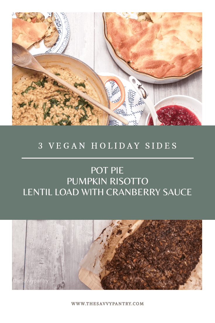 Welcome to the 3rd post in my Vegan Holiday Series! I will be sharing with you 3 easy mains that you can impress any guest! All of these recipes take 30 minutes or less to prepare which is always great during this hectic time of year. I’m excited to share with you my pot pie made easier with store bought pastry, a lentil loaf with homemade cranberry orange sauce and a pumpkin barley risotto that is so creamy that you’re guests won’t even realize it’s made with barley!