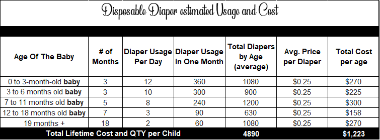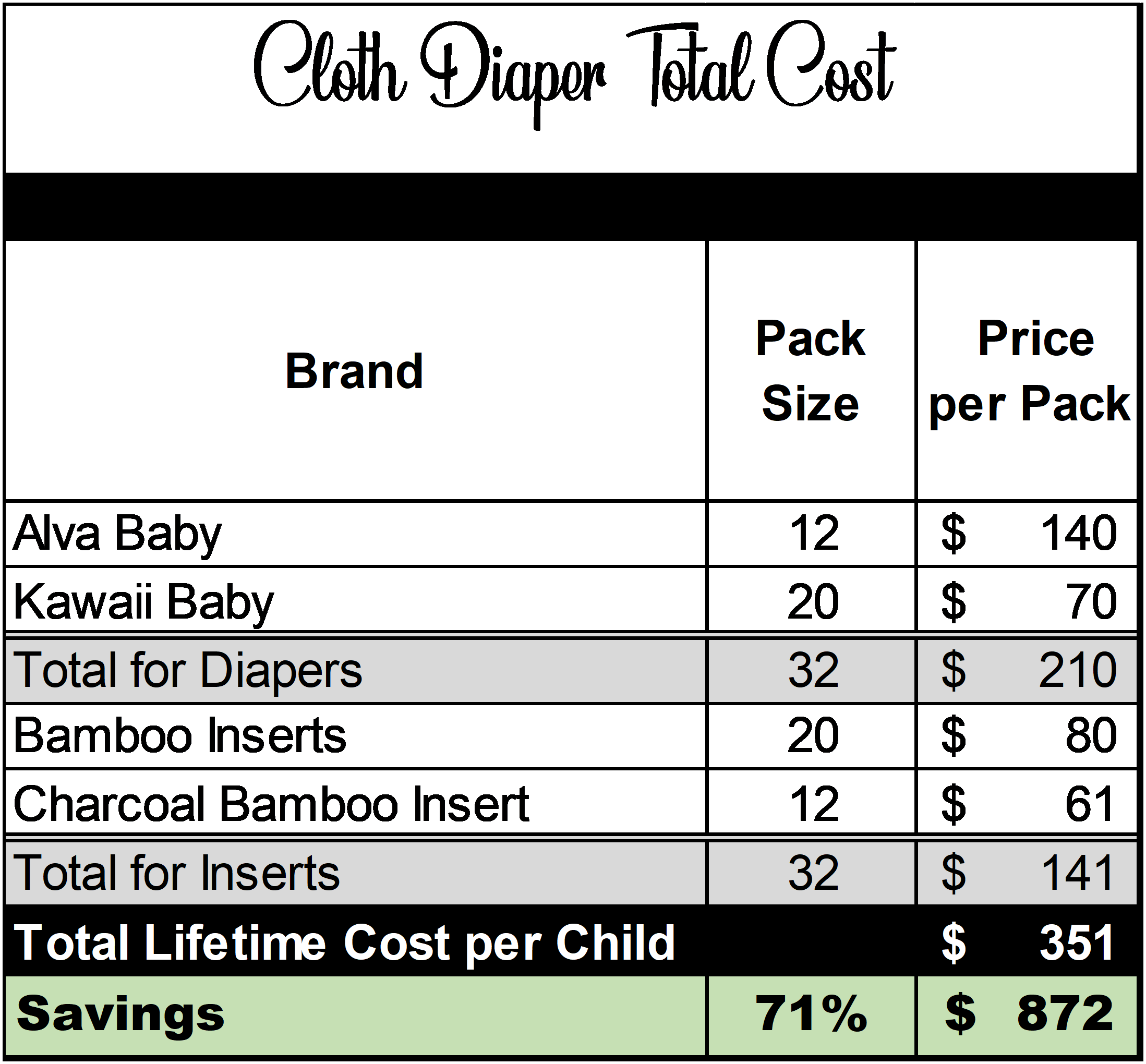 - See the charts above! Based on my conservative calculations, you end up saving almost $900 per child, however that doesn’t take into account the amount of diapers you are diverting from the landfills! The savings can be even larger if you purchase second hand reusable diapers, or if you have them gifted from your gift registry, so do keep that in mind as well.