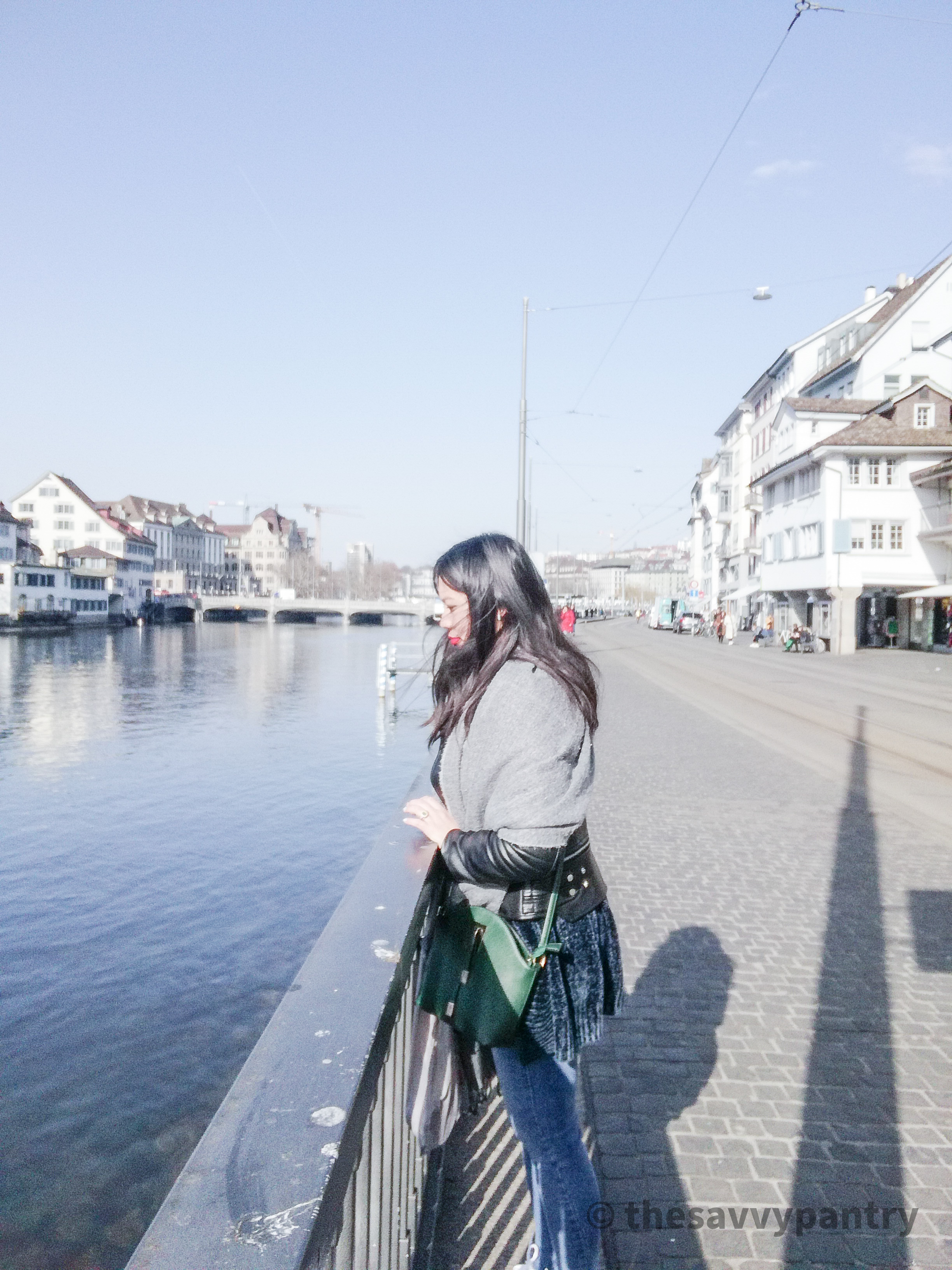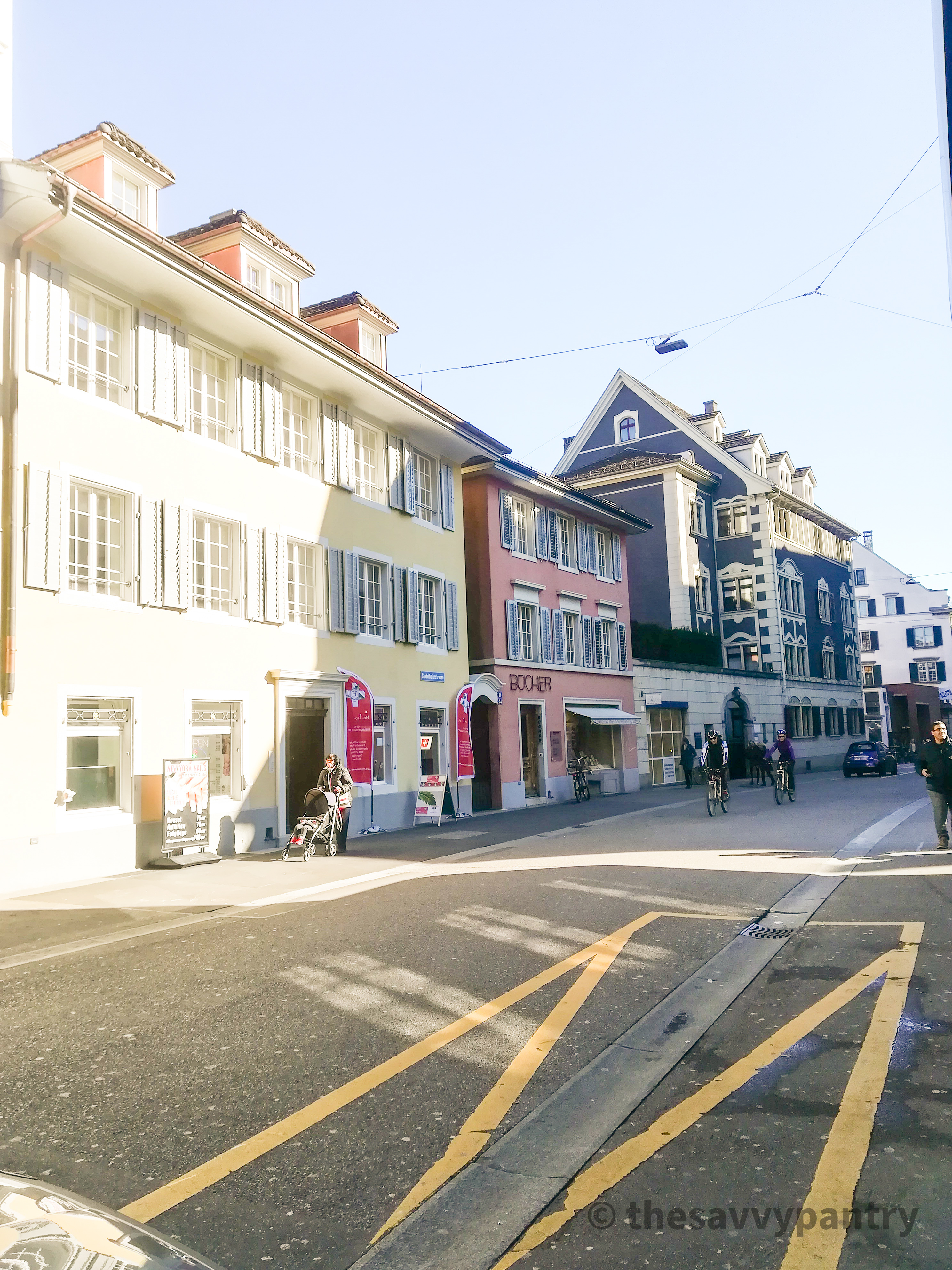 After taking in the sights of the city and posing for a few photo ops, we walked over to Town Hall Bridge, which is a pedestrian bridge that crosses over Lake Zurich. It is very lively with lots of people and families walking around and taking in all of the sights. It’s a great place for photo ops since you can see the swiss alps in the distance. On a clear day, you can even see the white caps on top of the alps! Photos do not do it justice and you will definitely need to see it for yourself in person.