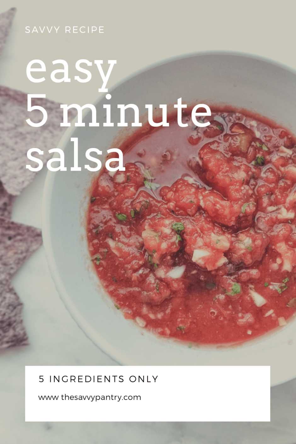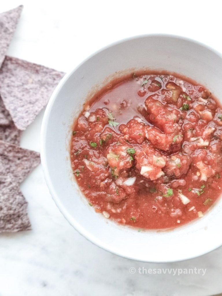 I love having a well stocked pantry so that I can whip up any recipe that my family is craving that week without having to go to the grocery store. One of my pantry staple recipes is this easy 5 ingredient salsa. The base of this salsa is canned diced tomatoes, and it uses ingredients that are already in my fridge and pantry. The only ingredient that we may or may not have is cilantro, but a quick hack is to save some in the freezer for last minute recipes like this one.
