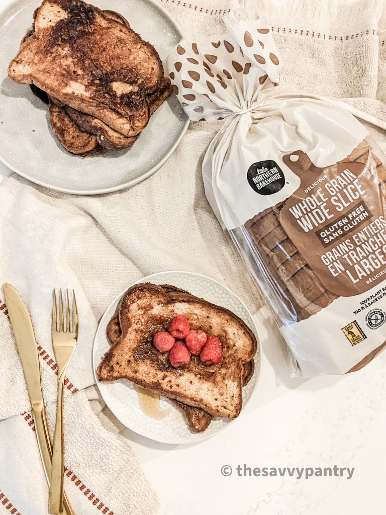 I love using the Whole Grain Wide Slice Gluten Free Bread in this recipe as it is both sturdy enough for frying and soft enough to absorb all of the French toast goodness.